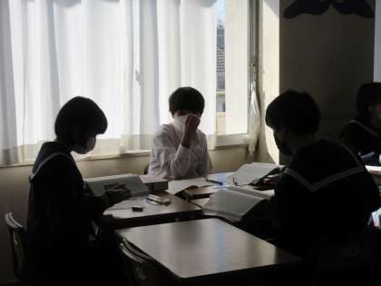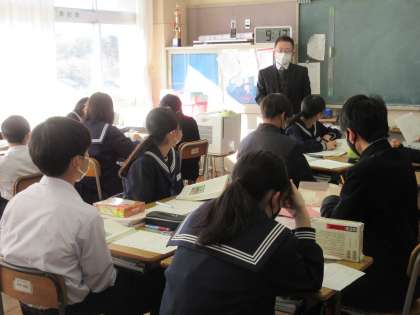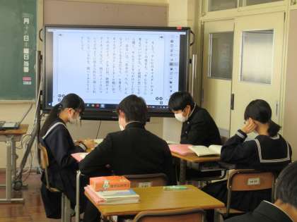 2月16日(木)今日の授業風景 その2 公開日 2023/02/16 更新日 2023/02/16 お知らせ 1年生の国語科の授業です。 「ニュースはどのように編集されているのだろうか」という課題のもと、グループでの活動に取り組んでいました。教材文「ニュースの見方を考えよう」の文章で、筆者が言いたいことをつかもうと、積極的に自分の考えを発表する生徒たちの姿が見られていました。