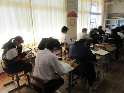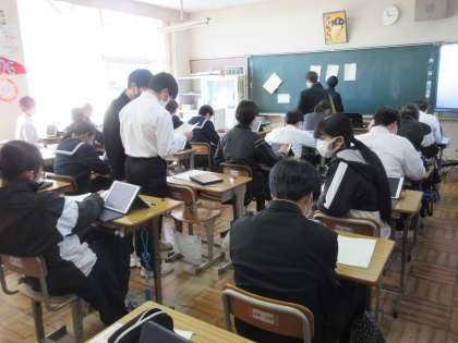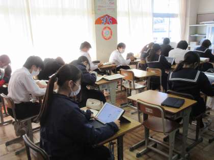 2月16日(木)今日の授業風景 その3 公開日 2023/02/16 更新日 2023/02/16 お知らせ 3年生の国語科の授業です。 3年生の各教室では、生徒たちが、5教科の時間は公立高校受検前の対策問題を解いている姿を多く見かけます。今日も国語科の時間に熱心に問題に取り組む生徒たちの姿が見られました。タブレットを見て確認したり、時には友達と考えを交流させながら、今日も頑張っています!