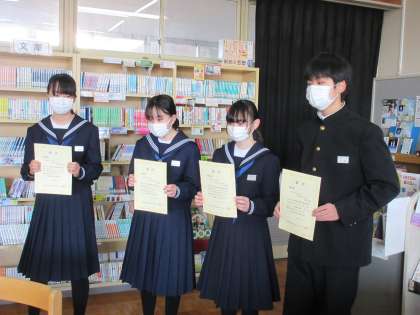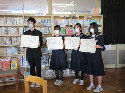 「みんなにすすめたい一冊の本推進事業」「令和4年度「宇宙の日」記念行事全国小中学生作文絵画コンテスト」「第25回ソロコンテストいばらき 一次審査 中学生の部」になります。オンラインでの表彰になりますが、しっかり返事をして賞状を受け取っていました。
