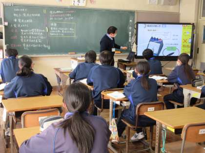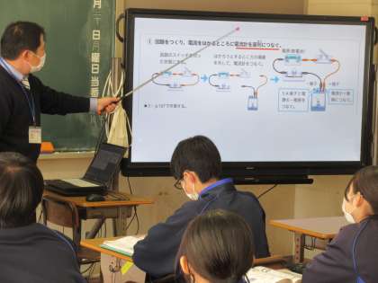 「電流とその利用」の学習を進めています。電源のプラス極からマイナス極に入るまでの間に電流の大きさは変わるのか、という課題のもと学習に取り組む生徒たち。大切な言葉をノートに書き留めながら、進んで学習に取り組む姿が見られました。