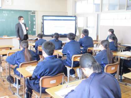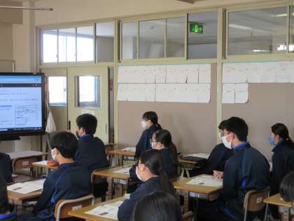 先週金曜日の学年末テストの返却とその解説が行われていました。テスト問題を開き、電子黒板に映し出されたポイントを聞きながら、集中して振り返る生徒たち。落ち着いた雰囲気の中、学習が進められています。