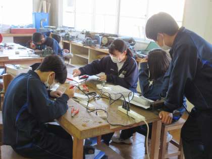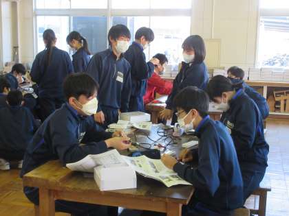 電子部品を回路に取り付けていく作業を進めていました。できるだけピッタリと、はんだを少なくというポイントを大切にしながら作業を進める生徒たち。一人一人の基板をみると、ていねいに作業を進めた後が見られました。一人一人が頑張っている姿が技術科の授業でもたくさん見られています。