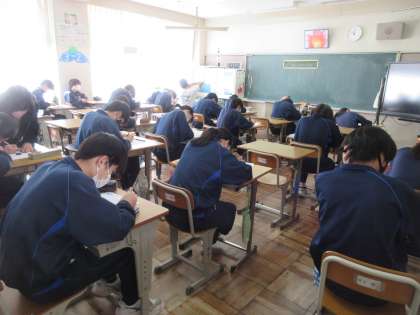2月21日(火)今日の授業風景 その3 公開日 2023/02/21 更新日 2023/02/21 お知らせ 3年生は、今日は千葉公立高校の受検1日目です。 教室では、高校受験に向けた対策問題にチャレンジしていました。総仕上げ・まとめの時期として、日々、頑張る3年生。今日も落ち着いた雰囲気で問題に取り組む3年生の姿が見られました。3年生の皆さん、もう一頑張りです。