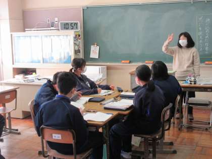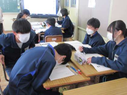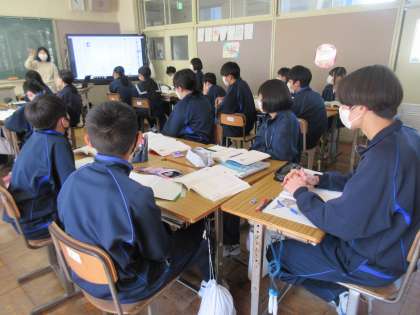 単元「詩にこめた作者の思いを伝えよう」の学習に取り組んでいます。教材文「わたしの一番きれいだったとき」の一連一連から、筆者の思いや表現方法などをつかんでいきます。グループごとに考えを交流する生徒たち。進んで自分の考えを交流し合える雰囲気。いつもいいですね!