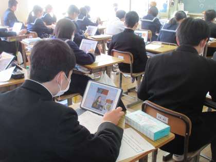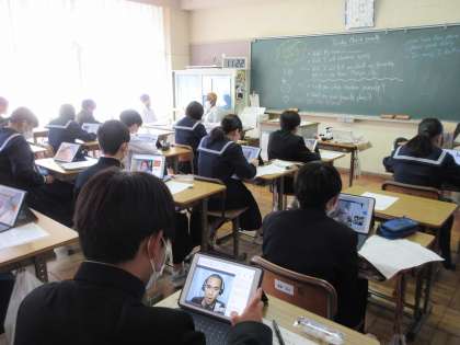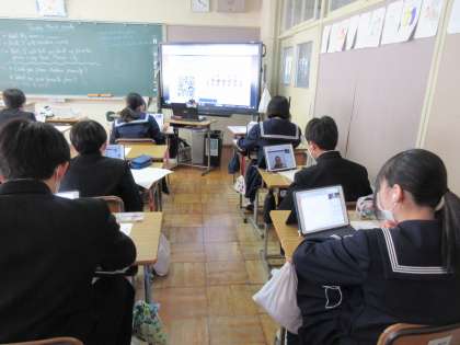 3月7日(火)今日の授業風景 その4 公開日 2023/03/07 更新日 2023/03/07 お知らせ 2年生の英語科の授業です。 DMM英会話にチャレンジしていました。「My Favorite Place in our Town」をもとに英会話を楽しむ生徒たち。話し合いが進んでくると、好きな食べ物やアニメ、趣味・・・などについて、会話が発展していました。積極的に英会話に親しむ2年生の姿が見られています。