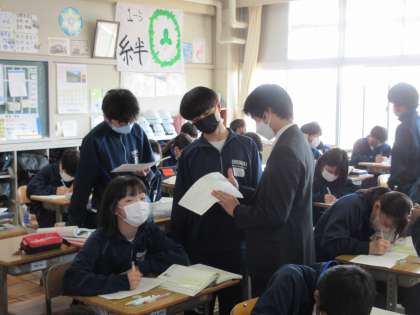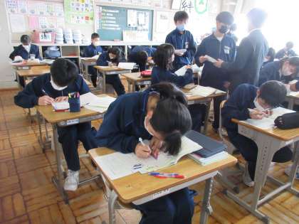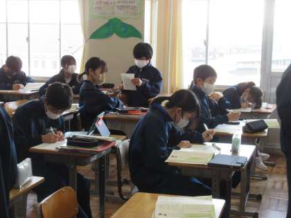 3月7日(火)今日の授業風景 その7 公開日 2023/03/07 更新日 2023/03/07 お知らせ 1年生の国語科の授業です。 「必要な情報を整理して」というテーマのもと、報告する文章づくりにチャレンジしていました。多くの情報をもとに記事にまとめ上げた生徒たち。授業の終わりに、担当の先生に助言をもらったり、時間一杯活用して根気強く記事づくりをしたりしていました。