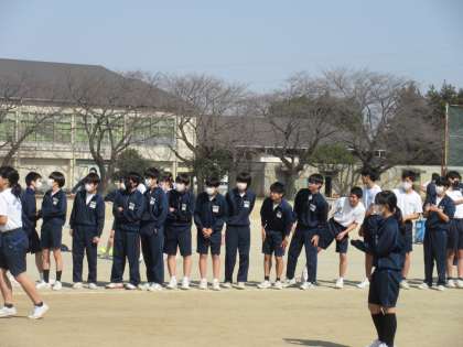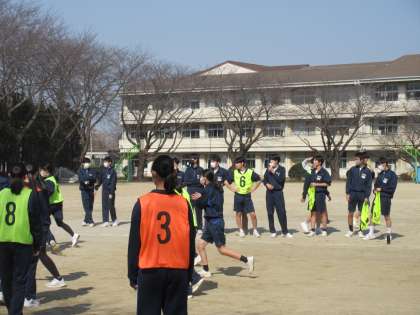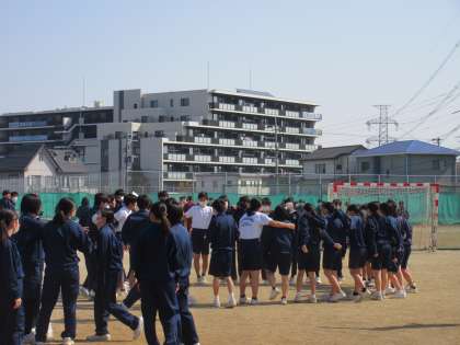 3月8日(水)今日の授業風景 その2【3年生学年レク】 公開日 2023/03/08 更新日 2023/03/08 お知らせ 競技種目は、サッカーとドッジビーです。グラウンドを訪れたときは、ちょうどサッカーの試合に女子が臨んでいるところでした。試合開始前に円陣を組む生徒たち。盛り上げっています!