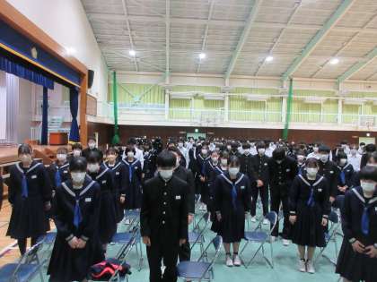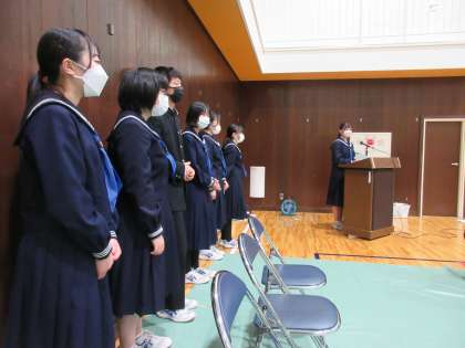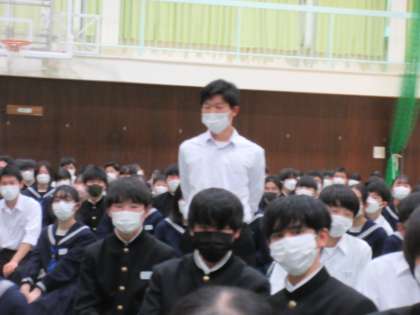 3月8日(水)3年生を送る会 その5 公開日 2023/03/08 更新日 2023/03/08 お知らせ 会の終わりかけた頃、3年生から感謝のあいさつをしたいと立ち上がる生徒。3年生全員で起立して、在校生や先生方にお礼をする場面がありました。さすが、御所ケ丘中3年生です!感動の一瞬でした。