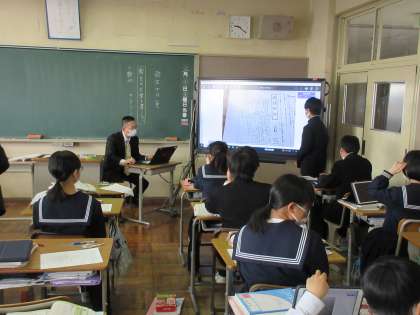 3月10日(金)今日の授業風景 その4 公開日 2023/03/10 更新日 2023/03/10 お知らせ 1年生の国語科の授業です。 今日の学習は「報告の文章の発表」です。これまで作り上げてきた報告文。あるグループでは、合唱コンクールについての報告文をつくり、「みんなの歌声 合唱祭」「全力 熱唱 合唱祭」・・・など題名や記事に工夫を凝らしていました。こういった活動を通して、発表する力をどんどん高めてほしいと思っています。