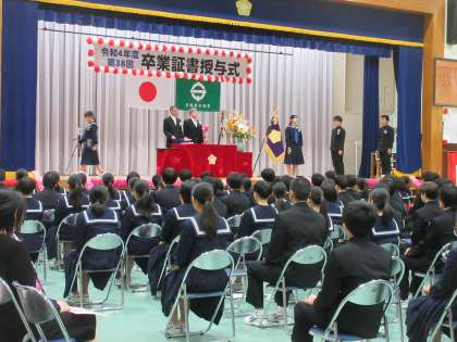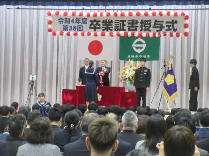 3月13日(月)第38回卒業証書授与式 その3 公開日 2023/03/13 更新日 2023/03/13 お知らせ 〇式辞の一部を紹介しながら、本日の卒業証書授与式の様子を紹介します。 卒業という今日のよき日に、今、皆さんは大きく夢と希望をふくらませていることと思います。私が、卒業生の皆さんと一緒に学校生活を過ごしたのは一年という期間でしたが、多くのことが心に刻まれた一年間となりました。