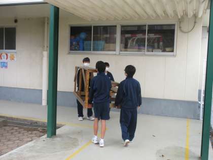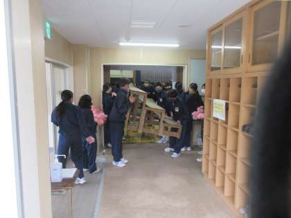 朝の時間が終わると、1・2年生は体育館や教室の卒業式の片付けに取り組んでいました。椅子や代を運んだり、紅白幕をたたんだり、花を移動させたり生徒たちは進んで活動してくれています。どんなことにも進んで取り組む1・2年生。これからの活躍が楽しみです。