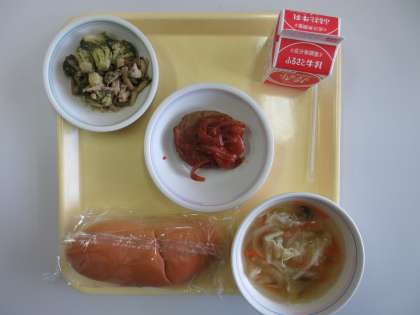 今日の給食のメニューは、ミルクパン・牛乳・ハンバーグデミグラスソース・ブロッコリーのガーリックソテー・春キャベツのコンソメスープ です。