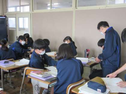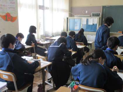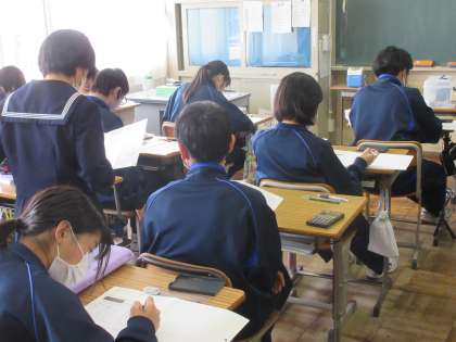 データの分析の学習のまとめに入りました。範囲と度数分布などについての問題を解いています。1年生も、自然に友達と解き方を確認したり、根気強く自分の問題の解決に当たったり、頑張っていました。男女分け隔て無く雰囲気よく学習に取り組んでいるので、ついつい写真を撮ってしまいます。