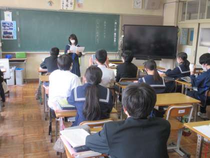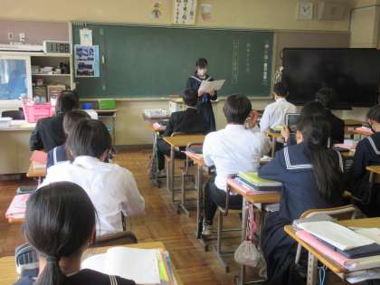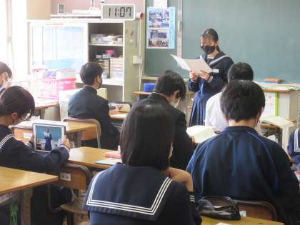 3月16日(木)今日の授業風景 その3 公開日 2023/03/16 更新日 2023/03/16 お知らせ 2年生の国語科の授業です。 「いきいきと発表しよう!」という課題のもと、教室の前に立ち、つくりあげた作文を発表する生徒たち。心情・情景・人物描写を工夫して作品をつくり上げていました。学校行事や宿泊学習など、2年生を振り返り、書き出しを工夫したり、擬音語を活用したりして、すてきな作文をつく上げています!(聞く生徒たちの姿勢も素晴らしかったです!)