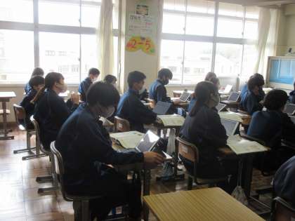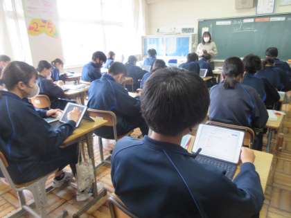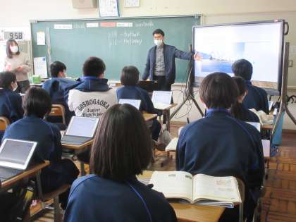 3月17日(金)今日の授業風景 その2 公開日 2023/03/17 更新日 2023/03/17 お知らせ 2年生の英語科の授業です。 「世界遺産への旅」の学習に取り組んでいます。ALTから示される「世界遺産」の資料を見て、自分の調べてみたい、行ってみたい世界遺産を考えていきます。ALTのどこの国の正解遺産かなどの質問に進んで答える生徒たち。今日も積極的に取り組んでいます。