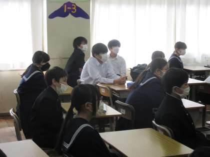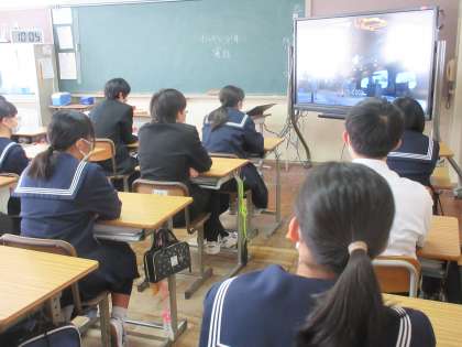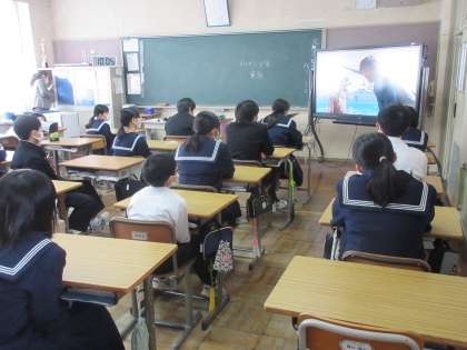 「イルカと少年の実話」の英語の動画を見ています。英語の会話を熱心に聞く生徒たち。集中して動画を見る姿から、この1年間の英語の学習で、着実に英語を聞き取る力がアップしているなと感じました。