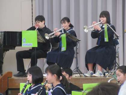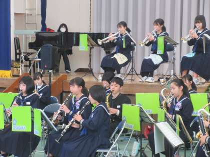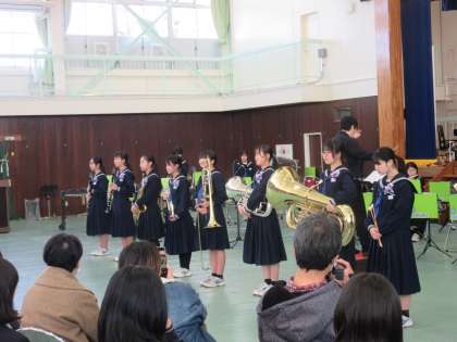 3月19日(日)吹奏楽部スプリングコンサート その5 公開日 2023/03/19 更新日 2023/03/19 お知らせ 次々に元気に出る、明るく楽しい演奏に、会場も盛り上がっていきました。コンサートの最後には卒業した3年生の紹介もありました。3年生の晴れ姿、そして1、2年生の努力の成果をお客様に見せることができました。(顧問の先生も一緒に楽器の演奏をしています。) 今後も、本校吹奏楽部の生徒への応援よろしくお願いします。