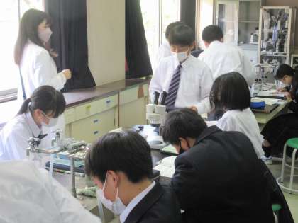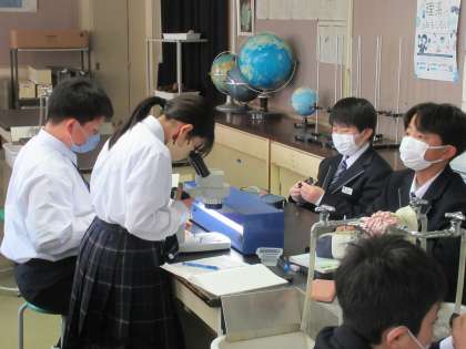 「タンポポの1つの花のスケッチをする」という目標をもち、ルーペや双眼実体顕微鏡で観察しています。目標に向かっていろいろな方法で観察に取り組む生徒たち。新たな気付きにつながったことでしょう。