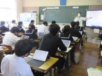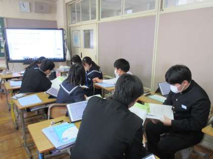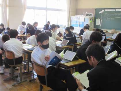 4月20日(木)今日の授業風景 その8 公開日 2023/04/20 更新日 2023/04/20 お知らせ 3年生の英語科の授業です。 「世界ではいくつの言語が話されているのか」の英文を声を担当の先生の示す英文を見ながら、声を出して読んでました。「〇〇以上・・・」など、使われる用法の確認もバッチリです。その後は、ペアになって読む活動です。今日も温かい雰囲気の中で学習が進む3年生です。