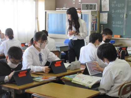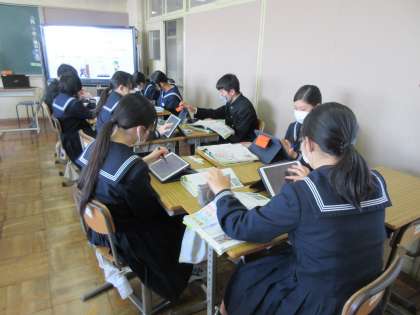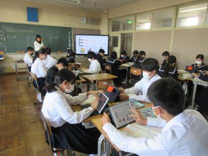 「日本の産業にはどんな特徴があるか」について、学習をすすめていました。第○次産業とは何かを、初めに明確にし、この後、特徴をつかんでいきます。「何を学ぶ」かを明確にすることで、生徒たちは集中して学習に取り組んでいます。