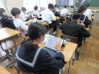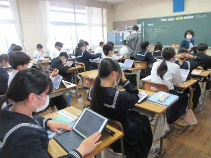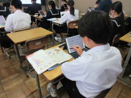 5月15日(月)今日の授業風景 その10 公開日 2023/05/15 更新日 2023/05/16 お知らせ 2年生の英語科の授業です。 「英語で、家庭科を学ぼう!」という課題のもと、海外旅行のお土産についての英文を読み取っていました。実際の言葉のやりとりから、文型などについて確認していました。身近に使う言葉から、英語に親しむ2年生。今日も頑張っています!