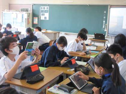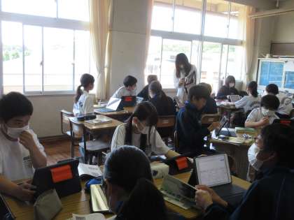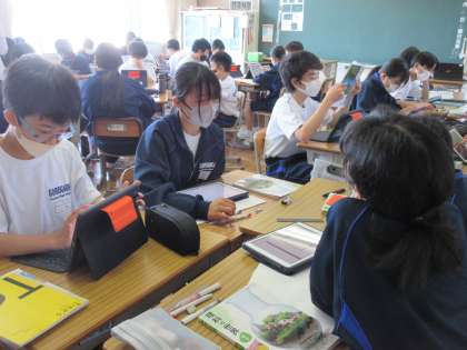 物質を調べるために、必要な器具類について、グループで予想を立てています。タブレットを活用しながら、「これが必要だ!」と話し合う生徒たち。資料やイラスト等をみながら、具体的な予想を立てることができていました。