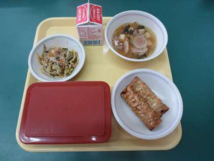 5月18日(木)今日の給食 公開日 2023/05/18 更新日 2023/05/18 お知らせ 今日の給食のメニューは、ごはん・牛乳・あげぎょうざ・野菜とビーフンのいためもの・ちゅうかスープ です。 3年生で歯科検診が給食準備時間に伸びてしまったクラスがあったそうですが、となりのクラスの生徒が配膳の手伝いをしてくれたそうです。クラスを超えた助け合い、素敵ですね! 今日もおいしく給食をいただきました。