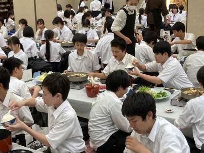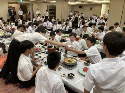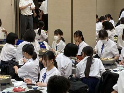 すき焼き。おかわりを積極的にして、しっかり食事をとる生徒たち。今日も、おなかいっぱいになりました。修学旅行3日目に備えます。(今日も、片付けも、ていねいに行っていました!素晴らしい!)
