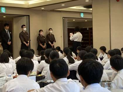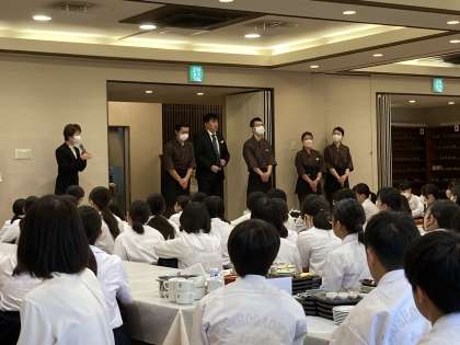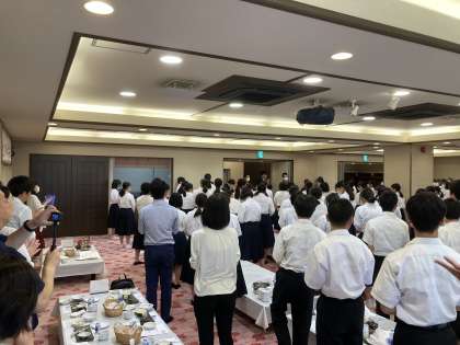 5月23日(火)修学旅行3日目 その6 公開日 2023/05/23 更新日 2023/05/23 お知らせ 食事終了後、退館式になりました。ゆっくり部屋で過ごせたこと、疲れが取れる美味しい食事だったことなど、感謝の思いを伝えてくれました。(宿の方からも、温かい言葉をいただき、感動の時間になりました。人の心を温かくさせる生徒たちの行動、最高です!)