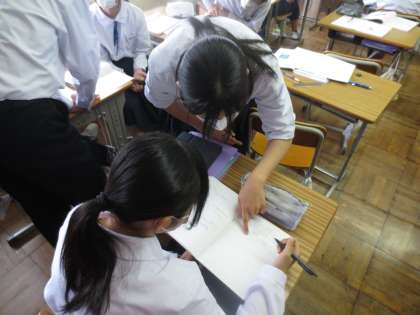 2年生の数学では、自分で考える自力解決のあと、仲間どうしで自然に教え合う姿がありました。どのように解いたか説明することで、根拠をもとに考える力、説明する力にもつながっていきますね。