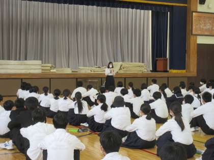 朝の時間を活用して、第3学年修学旅行 解散式が体育館で行われました。