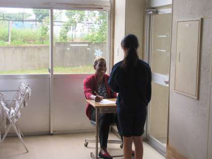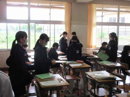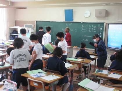 5月25日(木)今日の授業風景 その1 公開日 2023/05/25 更新日 2023/05/25 お知らせ 1年生の英語科の授業です。 「About me」(自己紹介)というテーマのもと、生徒たちは英語で「好きなこと」や「やっていること」を伝え合います。ALTの先生に伝えるチャレンジもしていました。友達どうしでも、英語をで伝え合う取組にも頑張ってチャレンジしている1年生です。