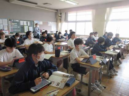 5月25日(木)今日の授業風景 その6 公開日 2023/05/25 更新日 2023/05/25 お知らせ 2年生の社会科の授業です。 「ヨーロッパ社会の3つの変化」をテーマに歴史の学習に取り組んでいました。ルネサンス・宗教改革・近世へ をキーワードに、資料を大切にしながら学習を進めていました。電子黒板に映し出された当時の様子を表す絵を見ながら、想像を膨らませていました。