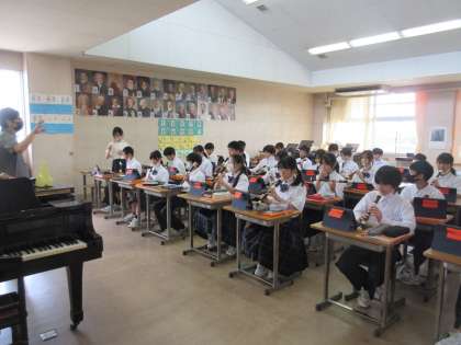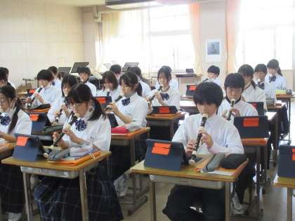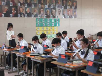 6月19日(月)今日の授業風景 その1 公開日 2023/06/19 更新日 2023/06/19 お知らせ 1年生の音楽科の授業です。 アルトリーコーダーの練習に取り組んでいました。上と下のパートに分かれての2部合奏。上と下のパートが上手に合い、すてきな音色が広がっていました。これからグループに分かれての練習です。一人一人の力がさらに重要になってきます。頑張って練習に取り組む1年生です。
