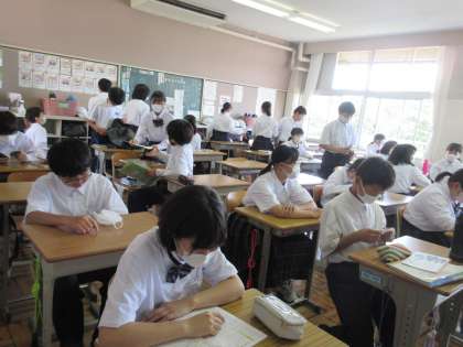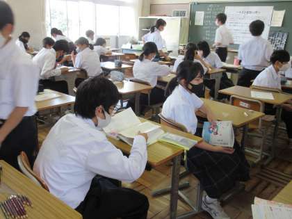 6月21日(水)朝の様子 その4 公開日 2023/06/21 更新日 2023/06/21 お知らせ 1年生は、初めての定期テストです。さっそく、朝の会前の教室を訪ねてみました。テスト直前ということもあり、教科書やワークを振り返る生徒が多く見られました。「緊張する」「もうすぐテストが始まる!」など声をかけてくる1年生もいました。中学校での初めての定期テストに緊張もあると思いますが、全力を出してほしいです!