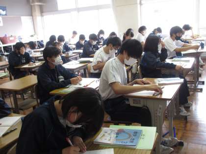 6月26日(月)今日の授業風景 その2 公開日 2023/06/26 更新日 2023/06/26 お知らせ 3年生の数学科の授業です。 「近似値をどのように利用すればよいか」というテーマのもと、√を活用した学習を進めていました。分母に√のある数字ををどのように有理化するか。担当の先生の説明を聞きながら、根気強く計算問題に取り組む3年生です。