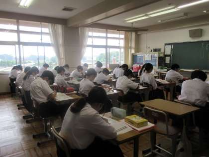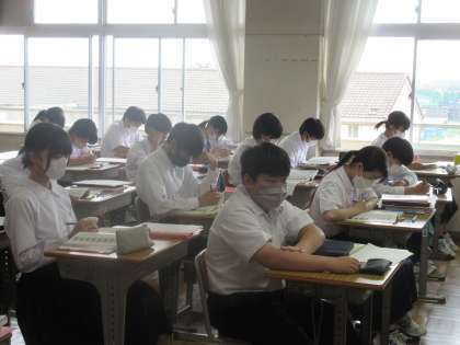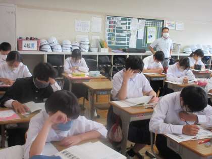6月27日(火)今日の授業風景 その8 公開日 2023/06/27 更新日 2023/06/27 お知らせ 2年生の国語科の授業です。 教材文「ハトはなぜ首を振って歩くのか」の学習を進めています。今日は全文を読み、全体の問いを捉えていきます。教科書の範読に合わせて、教科書をしっかり見る生徒たち。今日も集中して学習に取り組む2年生の姿が見られています。