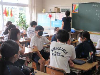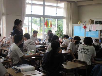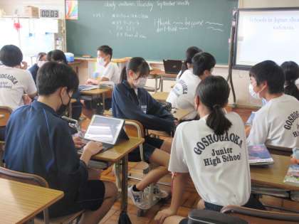 9月7日(木)今日の授業の様子 その6 公開日 2023/09/07 更新日 2023/09/07 お知らせ 3年生の英語科の授業です。 このあと実施されるオンライン英会話に向けて、事前の練習に取り組んでいました。近くの友達やグループで積極的に英語でコミュニケーションをとる生徒たち。頑張っていました。今日は「I think 〜 because 〜.」の文型を使っての会話です。外国の方との英会話。よい経験になっているようです!