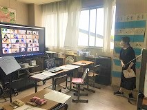 1年生の音楽の授業です。対面と同じ雰囲気の授業が進みます。先生方もお互いにオンライン授業スキルを学び会っています。