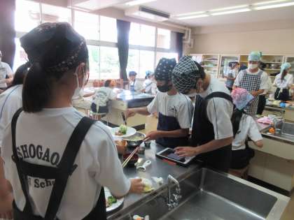 調理室では、グループで協力して調理実習に取り組む生徒たちの姿が見られました。。おいしいしょうが焼きとポテトサラダができあがったことでしょう!