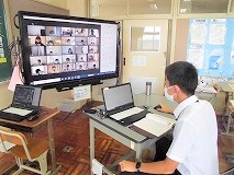 1年生の国語の授業です。方言について学んでいます。画面共有中は,チャットを活用して仲間達の意見を集めています。電子黒板では,仲間達の表情等を確認しています。この授業はTTで行い,3学級生徒約100名が参加しています。