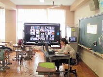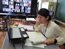 3年生の英語の授業です。先生が読んだセンテンスを,画面の向こうでは仲間達がリピートしています。頑張れ!