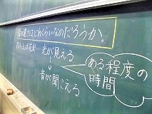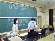 1年生の理科の授業です。今日は,「音の速さはどれくらいなのだろうか?」をいう学習課題のもと,2人の先生で役割分担しながら学習を進めています。