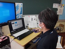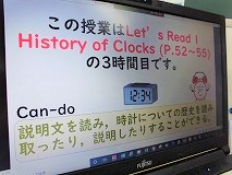 2年生の英語の授業です。今日は,説明文を読んで時計の歴史について読み取ったり説明したりすることが課題です。画面共有を効果的に活用し,授業が進んでいます。