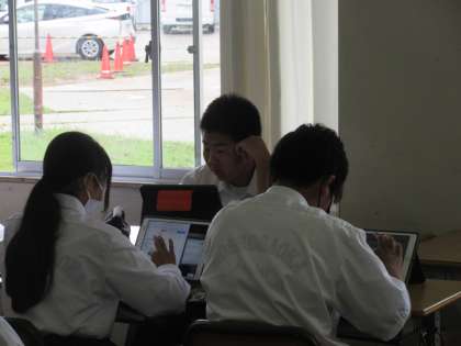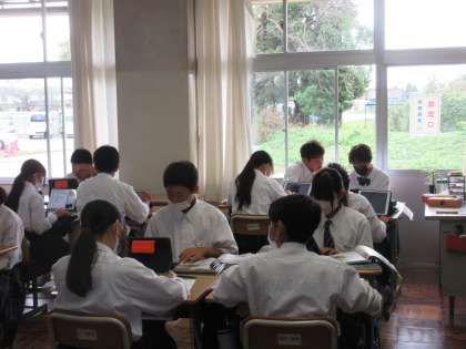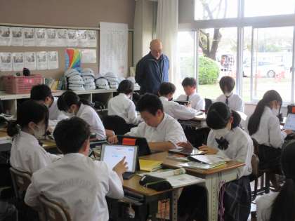 1年中、気温の高い地域の人々の暮らしを調べています。サモア国を取り上げ、住居・服装・食事・・・などをグループで協力して調べながら、課題に迫る生徒たちです。