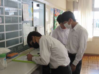 10月11日(水)学級旗紹介【2年5組の様子】 公開日 2023/10/11 更新日 2023/10/11 お知らせ 2年5組の学級旗。「個性」と「力強いチームワーク」をイメージした学級旗です。中央の龍の勢いだけでなく、細かいところのグラデーションも工夫しています。勢いよく物事に取り組む2年5組。これからの活躍も楽しみです! 朝の会前の時間を利用して、係の仕事を進める2年5組の生徒たち。協力体制もバッチリですね!