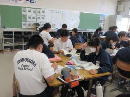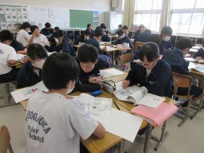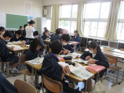 「おくの細道」の学習に取り組む生徒たちです。平泉の歴史がわかる資料をもとに、松尾芭蕉が旅でたどった道のイメージを広げていました。奥州藤原氏・義経・・・などの人物にもイメージを広げる生徒たちです。