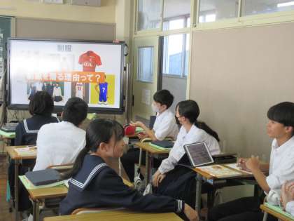10月16日(月)今日の授業の様子 その5 公開日 2023/10/16 更新日 2023/10/16 お知らせ 2年生の家庭科の授業です。 「目的に応じた着方」をテーマに学習に取り組んでいました。ちょうど、教室を訪問した時は「制服」について考えを膨らませる場面でした。制服は、「統一感を出すため」「所属が分かるように」「気持ちをきちっとするため」・・・など、近くの友達と話し合ったあと、積極的に意見を出す生徒たち。生徒たちの1つ1つの考えに、ついつい頷いてしまいました。