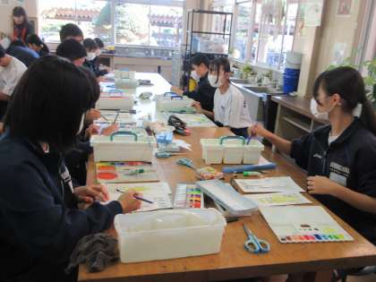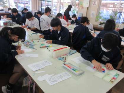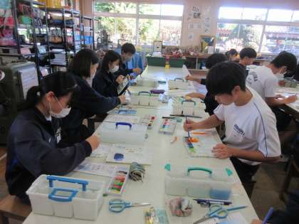 桔梗祭に向け、全校作品づくりに取り組む生徒たちです。今年度のテーマは「炎」。生徒たち1人1人も、作品づくりに参加します。ちょうど美術室(改修工事のためもと金工室だったところが美術室になっています。)では、3年生の生徒たちが自分の炎を描いているところでした。これまでの学習を活かし、色づくりやグラデーションを工夫する生徒たち。生徒たちの思いを感じる炎(作品)づくりです!