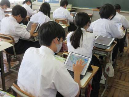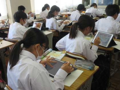「アジア州にはなにがあるか」をテーマに学習を進めています。タブレットに映し出されたアジア州の地図に、書き込みながらアジア州のイメージを広げる生徒たち。画面を大きくしたり小さくしたりしながら、工夫してまとめる生徒たちです。